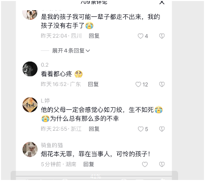 网友表示如果自己的孩子这样,一定会心如刀绞,生不如死,这孩子太可怜了,这么小就要受到这样的伤害;另外是网友就说,这不怪炮仗,烟花爆竹事故年年都有,主要是安全教育没有做到位。
