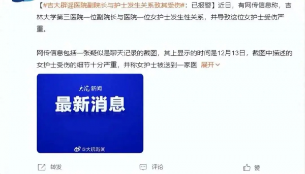 据多方消息透露,吉林大学中日联谊医院的副院长被指控与一名女护士发生性关系,导致女护士受伤严重。有传言称女护士甚至已经去世。一份疑似聊天记录的截图显示,事件发生于12月13日。