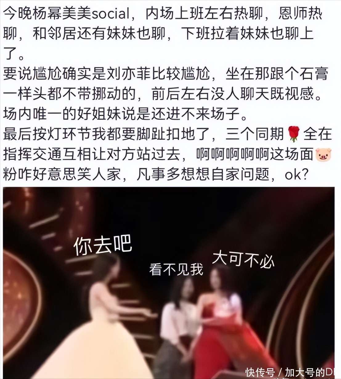 最抓马的是,当微博女王刘亦菲早早站上舞台准备大合照时,杨幂和刘诗诗、杨颖三人当即变成了交通指挥家,站在舞台边上互相谦让。