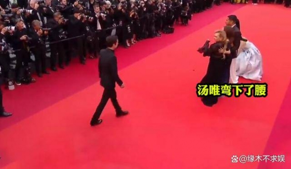 在动图中更能看的清晰一点,汤唯穿着礼裙弯腰给对方提裙,那位外国女星却站着没动,一副理所当然的样子。