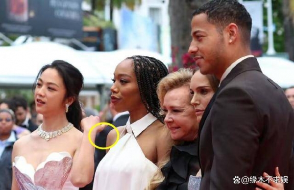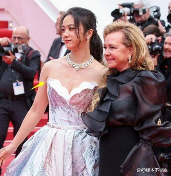 在汤唯和国外女星的侧面合影中,也能看到这个槽点,就连下车的时候,摄影师还贴心的为汤唯的腋下打了码。