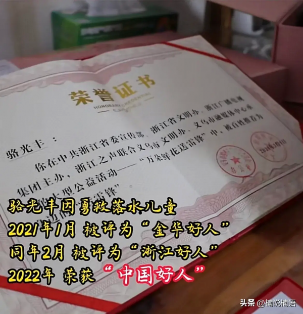 在浙江省金华义乌市福田街道新塘下村有一位叫骆光丰的老人,他先后荣获浙江省见义勇为先进人物、2022年度第一季度"中国好人榜",在今年12月,又被表彰为第八届浙江省道德模范(见义勇为模范)。