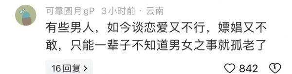 有些男人如今谈恋爱又不行,嫖娼又不敢,只能一辈子不知道男女之事就孤老了。