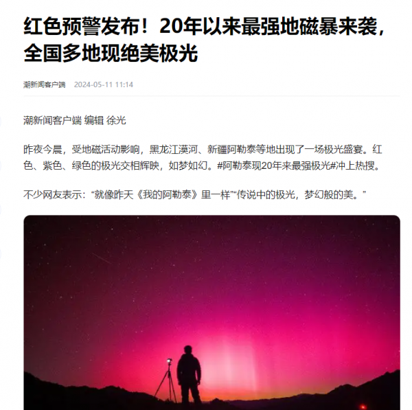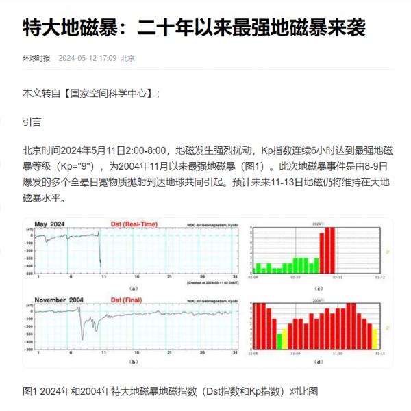 环球时报 2024-05-12 特大地磁暴:二十年以来最强地磁暴来袭