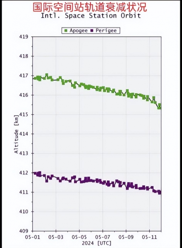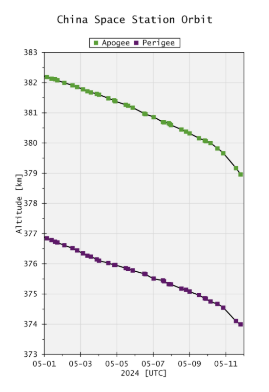 在5月1日至5月11日期间,我国"天宫"号空间站的远地点轨道高度从382.2公里下降至379公里以下,而近地点轨道高度也从377公里下降至374公里以下。