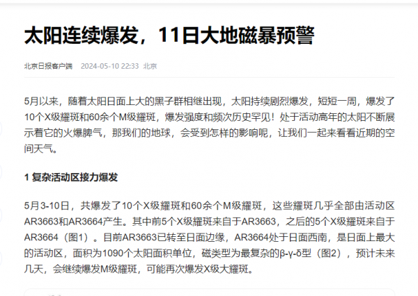 北京日报客户端 2024-05-10 太阳连续爆发,11日大地磁暴预警