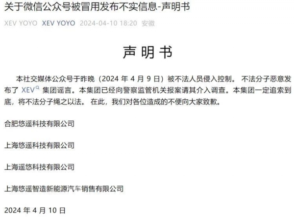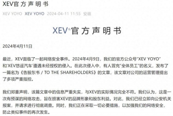声明称,4月9日,悠遥汽车官方公众号"XEV YOYO"和"XEV悠遥汽车"遭遇未经授权的侵入。有人冒充"全体员工"名义,发布了一篇名为《告股东书/TO THE SHAREHOLDERS》(以下简称"《告股东书》")的文章,该文章对公司的运营管理提出了多项严重指控。