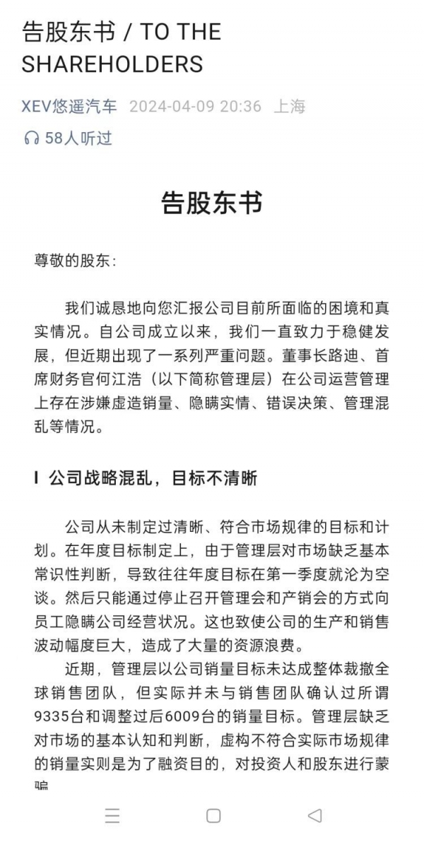 4月9日晚间,"XEV悠遥汽车"微信公众号发布了一份告股东书(中英文双语版),详细列举了管理层五大罪状,并直指公司董事长路迪、首席财务官何江浩在公司运营管理上存在涉嫌虚造销量、隐瞒实情、错误决策、管理混乱等情况。