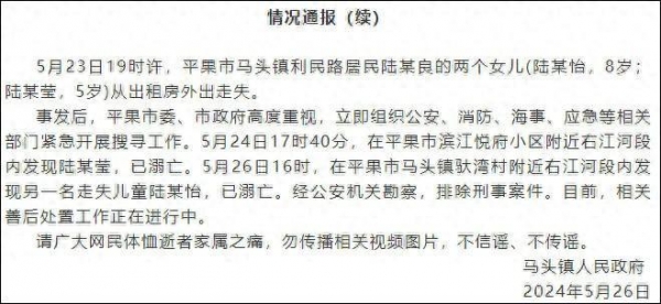 事发后,平果市委、市政府高度重视,立即组织公安、消防、海事、应急等相关部门紧急开展搜寻工作。5月24日17时40分,在平果市滨江悦府小区附近右江河段内发现陆某莹,已溺亡。5月26日16时,在平果市马头镇驮湾村附近右江河段内发现另一名走失儿童陆某怡,已溺亡。经公安机关勘察,排除刑事案件。目前,相关善后处置工作正在进行中。