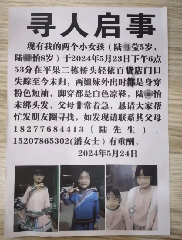 广西平果县委员会宣传部微信公众号"微言平果"再次发布情况通报称,23日19时许,平果市马头镇利民路居民陆某良的两个女儿(陆某怡,8岁;陆某莹,5岁)从出租房外出走失。