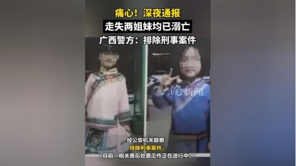据微信公众号"中国新闻网"报道,5月23日晚,广西百色平果市一对年幼的姐妹在自家店门口玩耍时失踪,母亲称她们离开家人视线不到两分钟,至24日下午已失踪超过20小时。孩子父亲称,附近有一条水流很急的小溪,他担心女儿落水了。