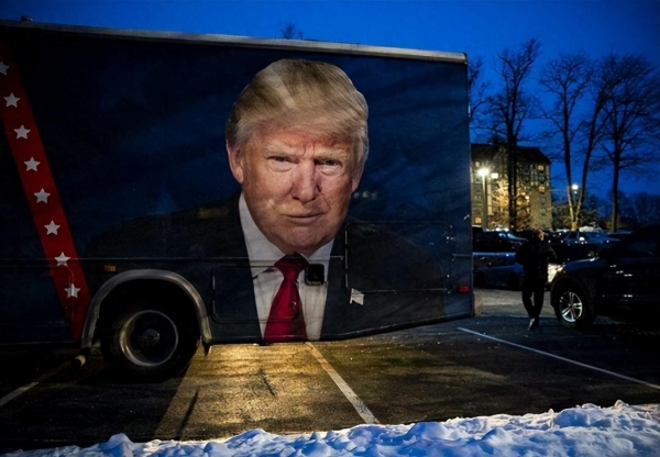 1月23日晚,在新罕布什尔州纳舒厄,一名特朗普支持者把特朗普的照片印在他的卡车上。图源:彭博社