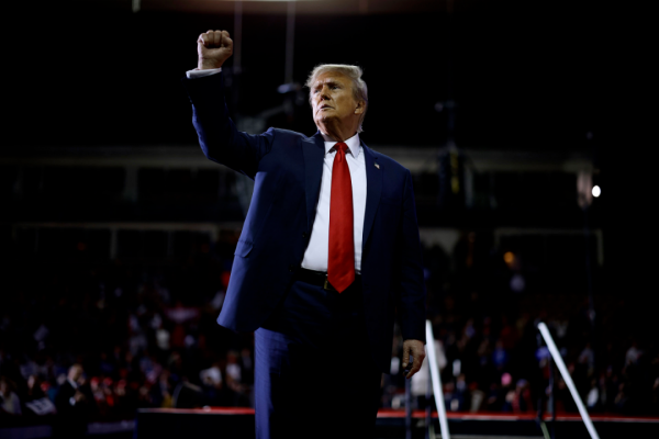 当地时间1月20日,特朗普在新罕布什尔州的一次竞选集会上举起手臂。图源:美媒