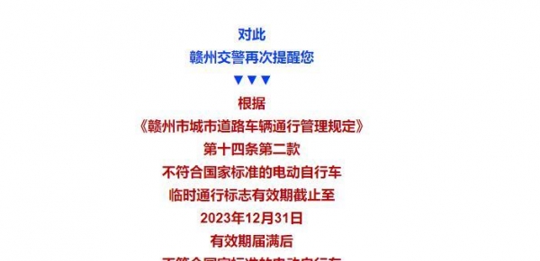 江西赣州交警提醒:根据《赣州市城市道路车辆通行管理规定》第十四条第二款规定:对于不符合国家标准的电动自行车,临时交通标志有效期至2023年12月31日;有效期满后,不符合国家标准的电动自行车不得上路行驶。