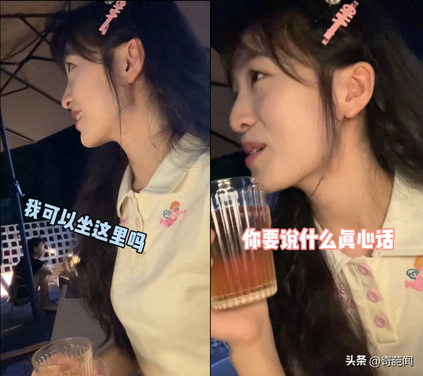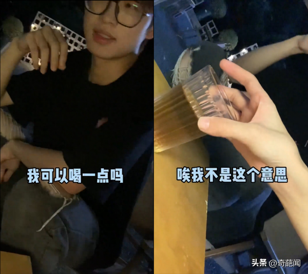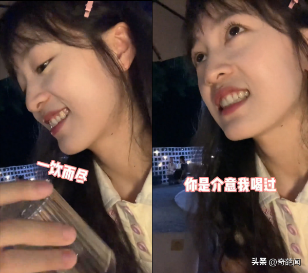接着女生又暗示男生道:"你怎么吞吞吐吐的?试一试才有机会啊"!随后学弟则发动进攻提出自己想喝一口女生杯子里的饮料,女生听完有恃无恐的直接将自己杯子递给了学弟,吓得对方有些迟疑了,