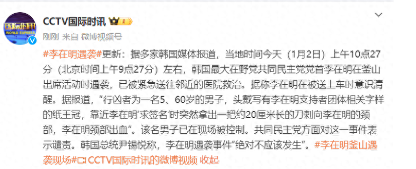李在明遇袭:在被送上车时意识清醒 行凶者为一名五六十岁的男子