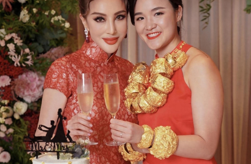 新郎并未过多曝光,只能从侧面窥视一二。不过从他高大健硕的体格来看,应该是一位相貌英武、阳刚力壮的男子汉。对于这位幸运儿的背景,外界暂且只能凭借猜测,不过能娶得如此豪门千金,想必其家世地位也是过硬的。