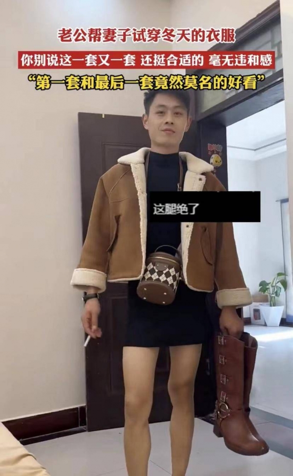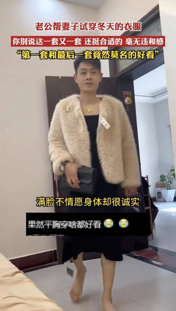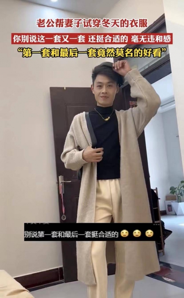 这位小伙子是河南人,当天妻子对他说,她最近购买了不少冬装,因为天气越来越冷了,不过,她不知道自己穿上是什么样的效果,所以想要老公帮忙试穿看看。