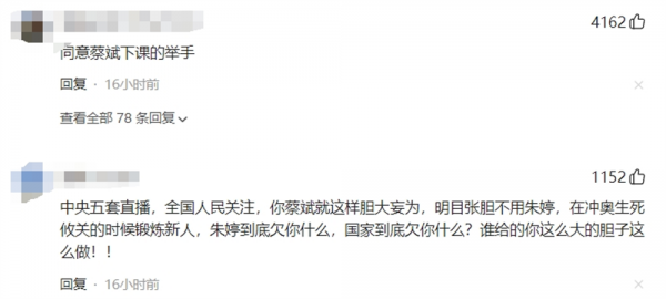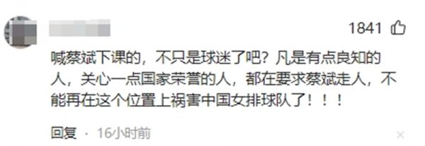 而其他网友的评论也是一边倒:"同意蔡斌下课的举手"、"在全国人民这样的关注下,居然敢这么胆大妄为不用朱婷,而且还用新人,到底是什么意思?"