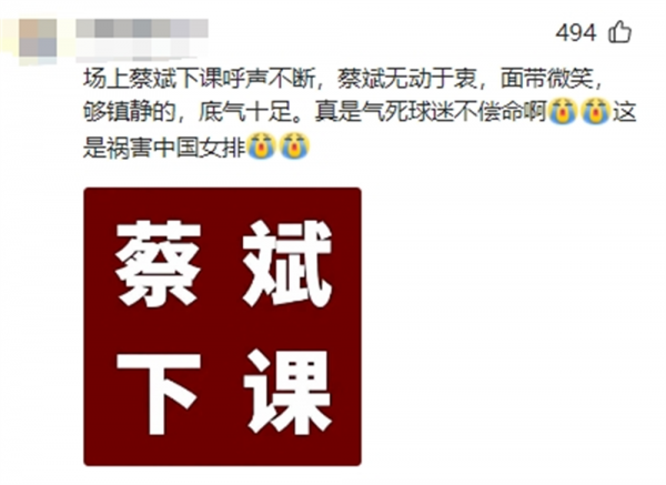 "场上高喊蔡斌下课,蔡斌却无动于衷,还面带微笑,真是底气十足,但是欠中国女主的该用什么来还"