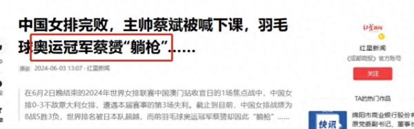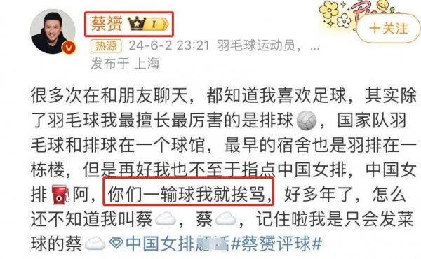 与此同时,也有不少网友喊着蔡斌下课!也被不少媒体报道,但谁也没想到,就在舆论愈演愈烈时,前羽毛球奥运冠军蔡赟却无辜躺枪,只是因为他与蔡斌名字相似,所以女排只要一输球他就会挨骂,这次也是实在忍不住了,所以才站出来喊冤。