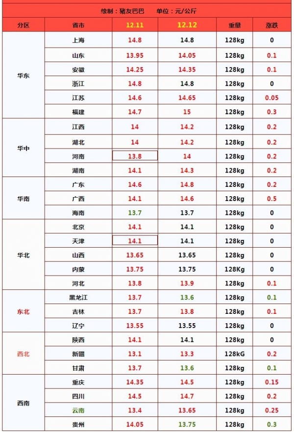 而在传统高低市场,黑吉辽地区,生猪出栏报价在13.55~13.8元/公斤,而在传统高价地区,川渝市场在14.5~14.7元,江浙市场报价14.65~14.8元,两广地区猪价涨至14.6~14.8元/公斤!