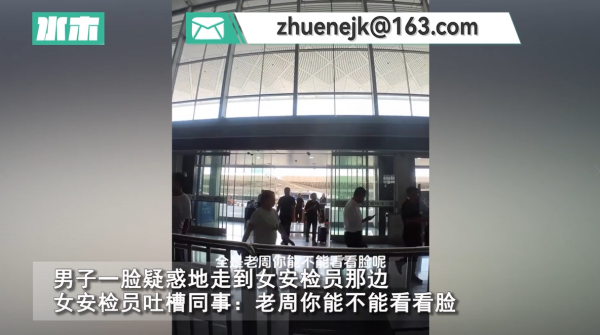 工作人员说"女的那边",随后男子就站在另一边,为了证明自己是男的说了"女"字,女工作人员看见是男子过来,笑呵呵的,为了缓解尴尬称"只看头发不看脸,老周你能不能看看脸"
