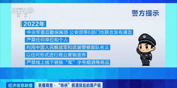 2022年,中央军委后勤保障部、公安部等6部门联合发布通告,严禁任何单位和个人利用中国人民解放军和武装警察部队名义,以任何形式进行商业营销宣传,严禁线上线下销售"军"字号烟酒等商品。