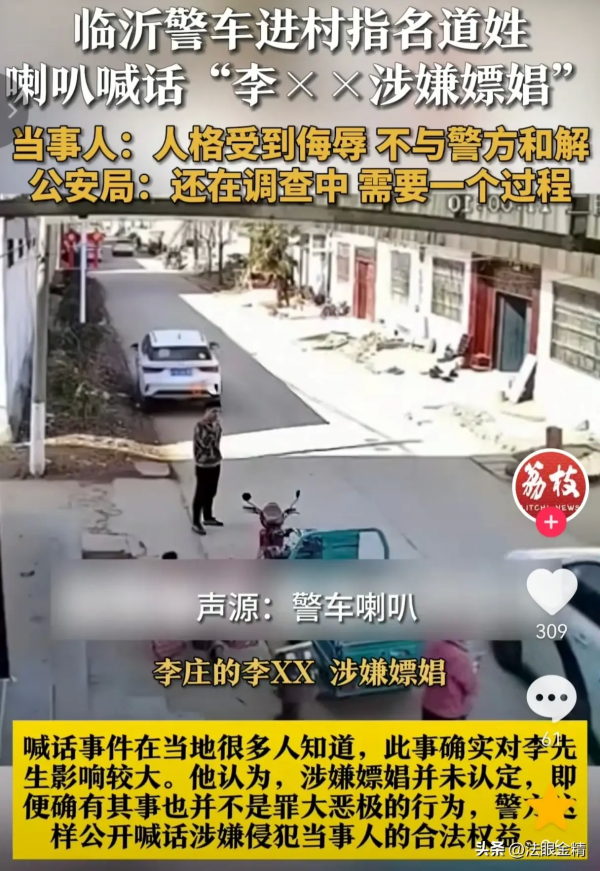 大年初四,家住山东临沂郯城县的李先生在村里的颜面扫地,当地警方驾驶着警车用喇叭在村里大喊"李XX,涉嫌嫖娼"。