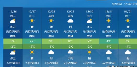 26日白天到夜间,全省天气多云。南风转北风3~4级。夜间最低气温:鲁南和沿海地区-3°C左右,其他地区-5°C左右。最高气温:鲁西北和北部沿海地区3°C左右,潍坊和鲁南地区9°C左右,其他地区6°C左右。