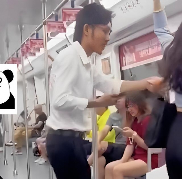 女子抓着车厢的扶手,往前走了几步,男子见状,主动站起身,把手里的物品,想要塞到女子的手里。