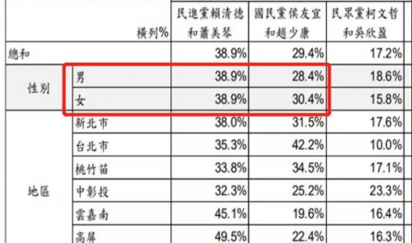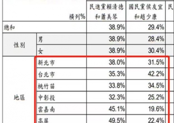 具体来说,侯康配在年轻选民中原本拥有不俗的影响力,但根据最新数据显示,在30至49岁这个年龄段里,他们的支持度几乎是"直线下坠"。而性别方面也是如此,无论男性还是女性群体中,侯康配的受欢迎程度都有所减退。更加值得注意的是,在地区维度上,他们原本稳固的票仓也出现了动摇。