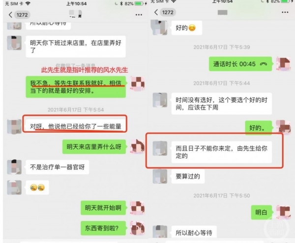 小丽和叶某的聊天记录中,叶某多次提到小丽的身体需要调理,推荐保健品后还多次指导小丽按要求进行服用。此外,叶某还向小丽推荐了一名"风水先生"。叶某称,"大师"告诉她已经给了小丽"一些能量",后续还需要根据"大师"的要求进行调风水。