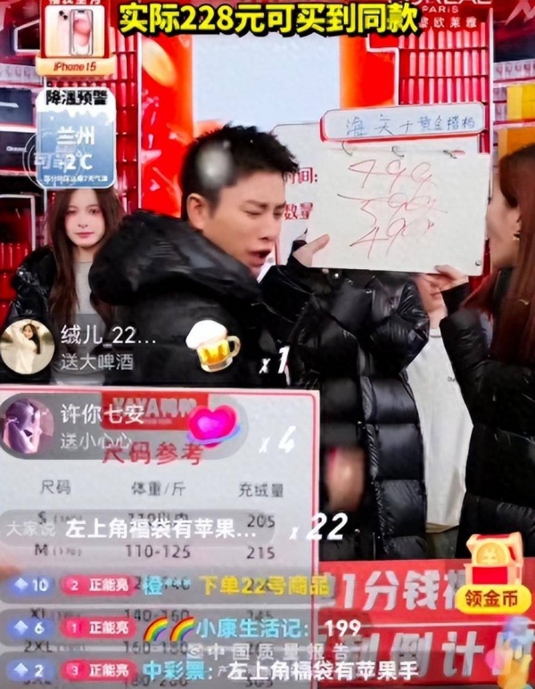 近日,有消费者称贾乃亮直播间"割粉丝非菜",宣称2899元鸭鸭羽绒服卖499元,实际228元可买到同款。