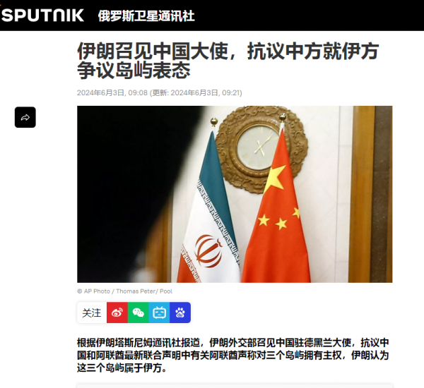 根据路透社的相关报道,伊朗外交部在中国与阿联酋发布了联合声明之后,就召见了中国驻德黑兰大使。