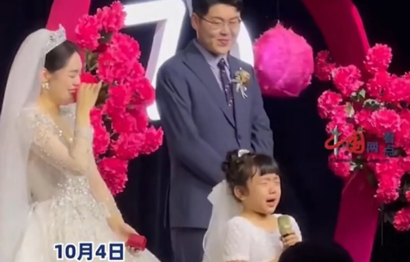 然而,就在这段感人至深的发言之后,小妹妹的情绪变得异常激动,泪水如雨般涌出。她的眼泪带动了整个现场的情绪,满满的感动充斥在每个参与婚礼的人心中,泪水模糊了大家的视线。