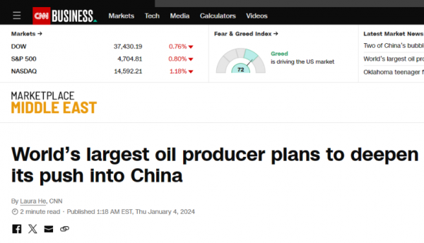 当地时间1月4日,美国有线电视新闻网(CNN)报道称,全世界最大的综合性石油和天然气公司--沙特阿拉伯国家石油公司(以下简称沙特阿美),正计划增加其在中国的投资,进一步进入中国市场。