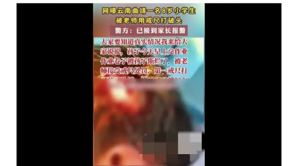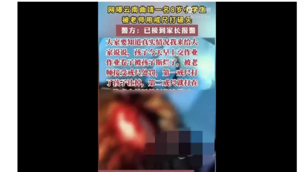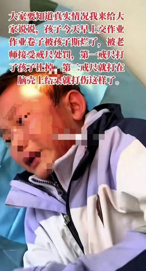 事件经过:据网友反映,这名学生在交作业时不慎将卷子撕破,被老师用戒尺乱打。第一次受到惩罚时,学生伸手保护头部,却遭到了第二次更加严厉的殴打,导致头部流血不止。