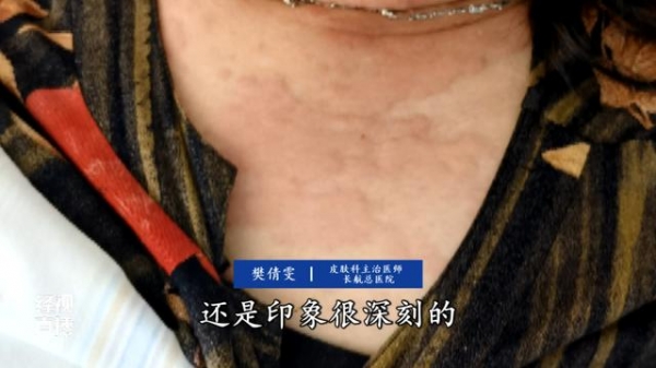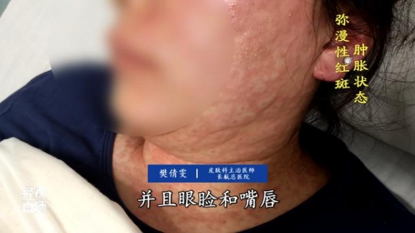 据主治医生介绍,苏女士来的时候,基本上看不出来原来的面貌了,整个头皮和面部都是一个弥漫性的红斑,眼睑和嘴唇都是肿胀状态,身上也有红斑和风团。
