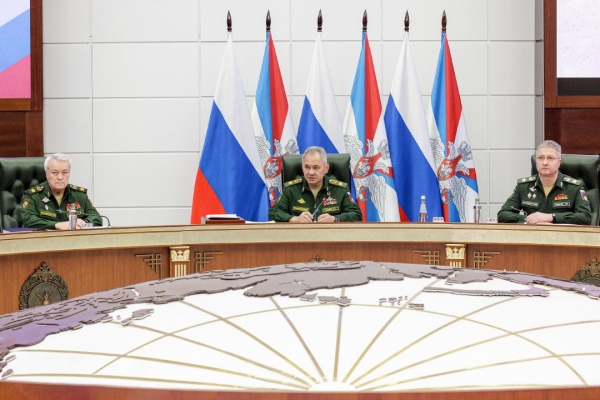 当地时间2024年2月27日,俄罗斯莫斯科,(左至右)俄罗斯国防部副部长尼古拉·潘科夫、国防部长绍伊古和国防部副部长伊万诺夫出席俄罗斯国防部会议。视觉中国 图