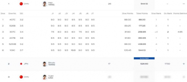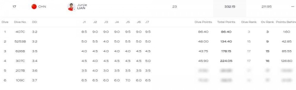 最后一轮109C,练俊杰虽勉强过关,得到70.30分,但已无力回天,总分为332.15分,排名全场倒数第一,无缘决赛。这一结果不仅令人震惊,更是中国跳水史上的罕见失常。
