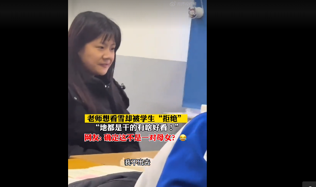 年轻女老师想拉开窗帘看雪,被班上学生出言“拒绝”,两人对话像极了母女 2023-12-22 14:56 今日头条 近日,窗外突然下起大雪,教室内学生们正在安静学习,年轻女老师嚷嚷着想看雪,却被学生直接拒绝。 学生疑惑"地都是干的有啥好看!"网友看完画面视频哭笑不得,评论到:这确定这不是一对母女?