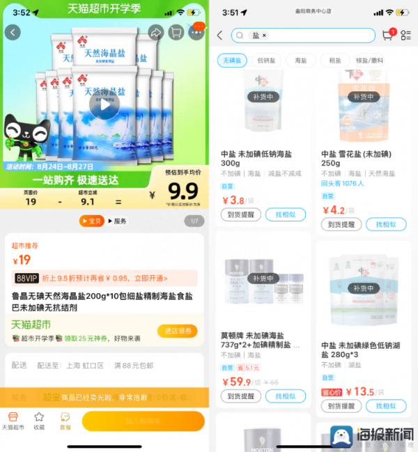受日本核污染水排海影响,我国部分市场发生食盐抢购现象。8月24日16时许,记者注意到上海地区盒马鲜生、天猫超市等线上购物平台显示多类食用盐已售罄。