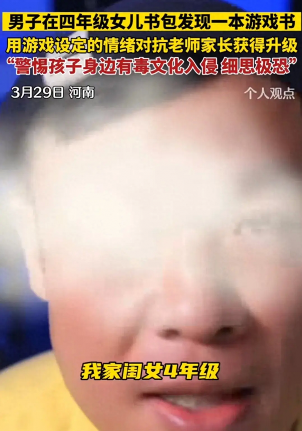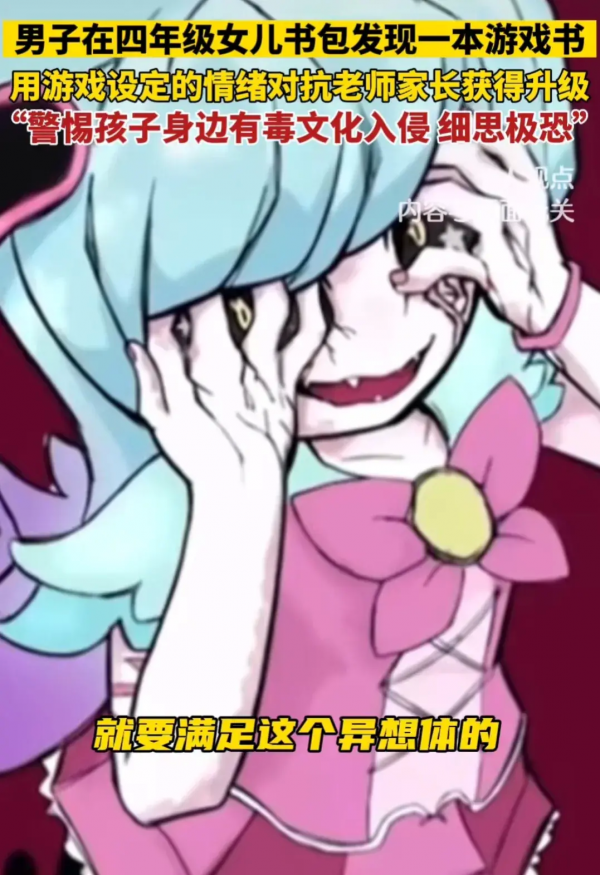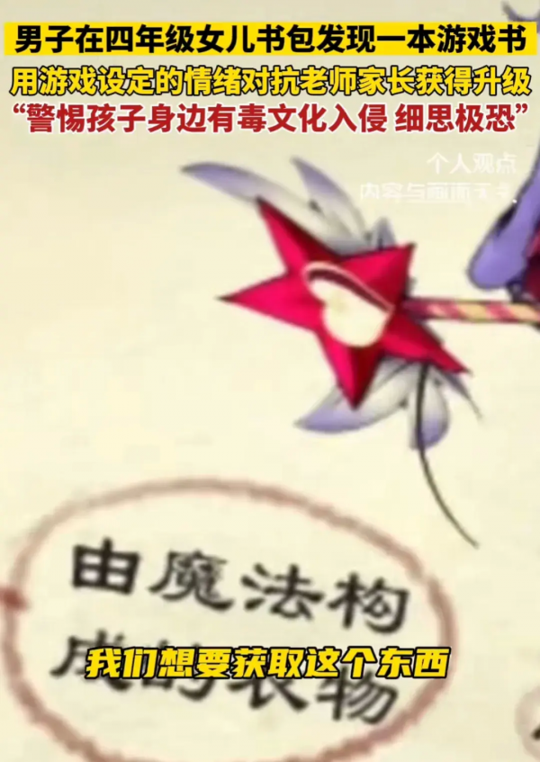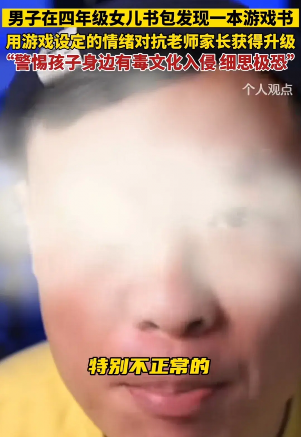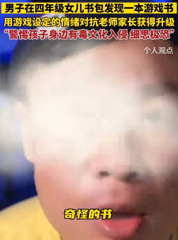 近日,一位男子在女儿的四年级书包中发现了一本神秘的游戏书。这本书能够通过游戏设定引导孩子们与老师和家长进行情绪对抗,并在战胜他们后获得升级。这种毒害我们孩子们的文化入侵必须引起我们的高度警惕!