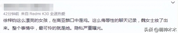 而从魏嘉晒出的聊天记录中窥见,高亚麟在被质问的时候只是轻飘飘地袒露是男人都会犯错的心声,把自己的道德问题映射到所有男性群体上。而且在提到徐梓钧的时候,还狠心地污蔑对方,如今女生大好年华不仅名声扫地,而且隐私也被严重曝光,付出了惨重的代价。