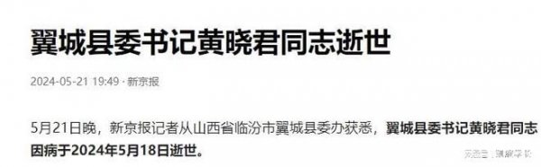 据官方媒体新京报从山西省临汾市翼城县委办获悉,山西临汾翼城县委书记黄晓君同志因病于2024年5月18日逝世,年仅55岁。
