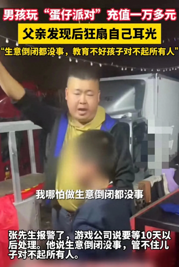 原来,该男子的儿子玩网易公司开发蛋仔派对游戏,仅仅两天时间就充值了近两万余元!男子发现后,立即报警,并表示:"自己没有把孩子教育好!子不教,父之过!我先扇自己十个耳光!""自己将手机拿给儿子玩蛋仔派对,孩子第一天充值了6千元,后面充值居然就免密支付了!孩子仅仅两天时间就充值近两万元!"