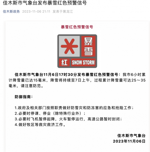 佳木斯市气象台11月6日17时30分发布暴雪红色预警信号:我市6小时累计降雪量已达15毫米,降雪将持续至7日上午,过程累计降雪量可达25~35毫米,请注意防范。