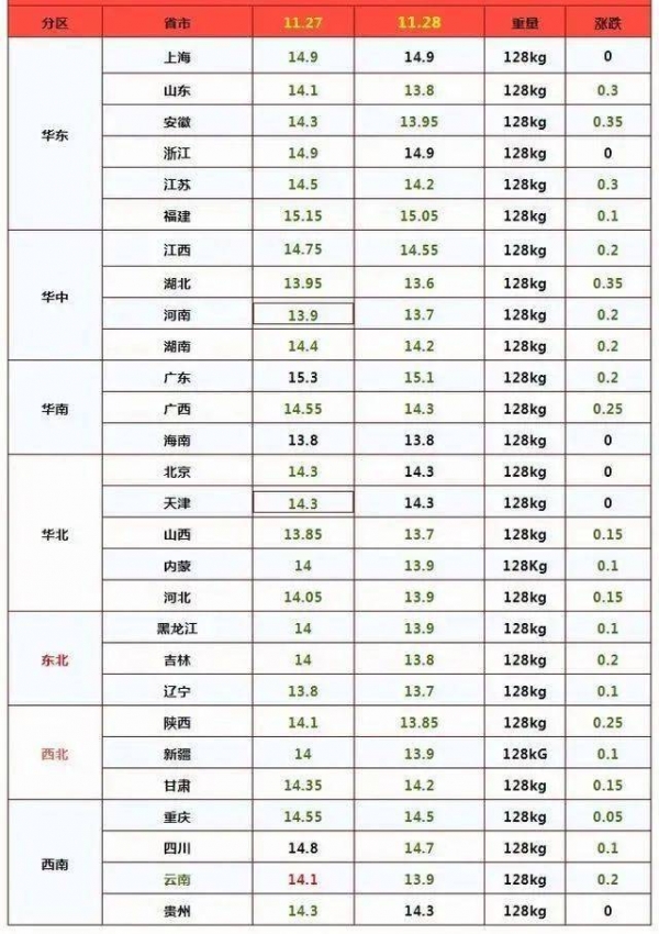在南方产区,西南市场,川渝报价跌至14.5~14.7元,云南市场跌至13.9元。在华东地区,山东、安徽报价跌至13.8~13.95元,浙江以及江苏报价14.2~14.9元,福建触底15.05元/公斤。在华中地区,河南市场报价跌至13.7元,湖北报价触底13.6元/公斤。在华南市场,两广地区,猪价降至14.3~15.1元/公斤!