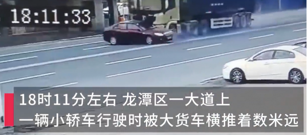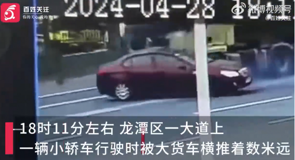 4月28日,吉林省吉林市龙潭区一大道上发生一起交通事故,一辆小型轿车在行驶中被一辆大型货车横向撞击推移数米。监控录像显示,两车同向行驶,随后小型轿车被货车横向撞击并推移。